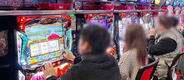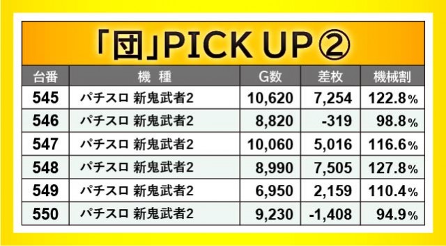 もちろん既存の機種群も奮闘しており、『パチスロ犬夜叉』532番台+3,255枚という記録が見られる。それ以上に奮闘したのが全6台設置の『パチスロ 新鬼武者2』だった。545番台10,620G・7,254枚や547番台10,060G・5,016枚、548番台8,990G・7,505枚など、大きな活気&熱気が放たれていたのが印象的だ。これらは6台横並び好況スポットが形成されていたため、すぐに気づけたファンも多いのではないだろうか。