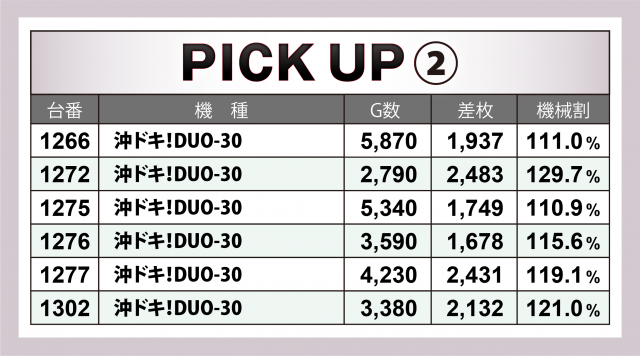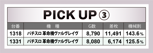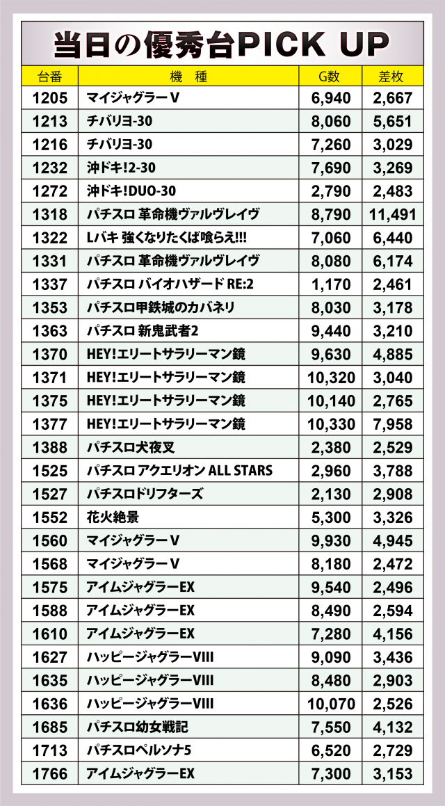 まずは優秀30台のPICK UPから。30台全てが差枚数+2千枚以上、+3千枚以上は18台と全体の半数以上、+4千枚オーバーは9台、+5千枚オーバーは5台となった。この日はスマスロが絶好調。後述する好調マシン以外では、+6千枚突破の『Lバキ 強くなりたくば喰らえ!!!』と好成績を収めた。その他の機種では+5千枚超の台を筆頭に3台トータルで+1万2千枚に迫った『チバリヨ-30』、共に+4千枚クラスの差枚数となった『パチスロ幼女戦記』『パチスロ アクエリオン ALL STARS』の出玉が光った。