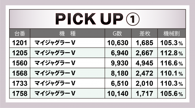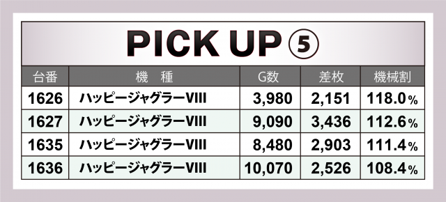 続いては当日好調だった5機種23台をチェック。全ての台が4桁以上の差枚数を達成した。先述した通り、スマスロ2機種がハイスコアを成し遂げ、『パチスロ 革命機ヴァルヴレイヴ』は+1万1千枚突破台を筆頭に2台トータルで+1万7千枚超え、 さらに『HEY!エリートサラリーマン鏡』は+8千枚弱の台を始めに5台の合計で+2万枚を突破。また『マイジャグラーⅤ』では+5千枚に迫る台を、『沖ドキ!DUO-30』『ハッピージャグラーVIII』それぞれで+3千枚クラスの台を複数輩出!
