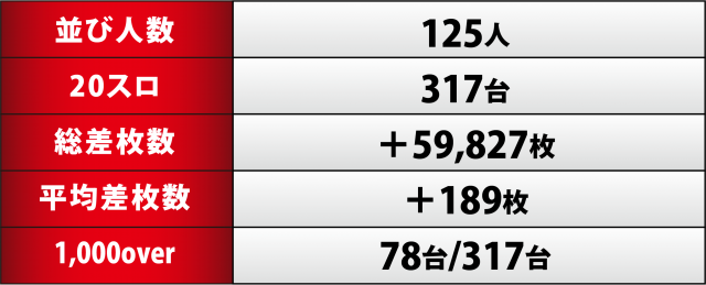 今回、20スロ317台は差枚数トータルプラス+59,827枚と高い数値をマーク。前回よりもさらに高いレベルを実現できた。また、1,000overが全体の4分の1弱と毎回高い水準を維持している。過去には+13万枚を達成した実績のある同店だけに、これからも今回よりも高い記録を目指して欲しいものだ。