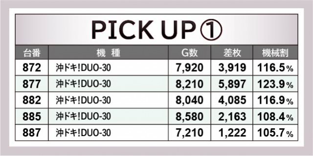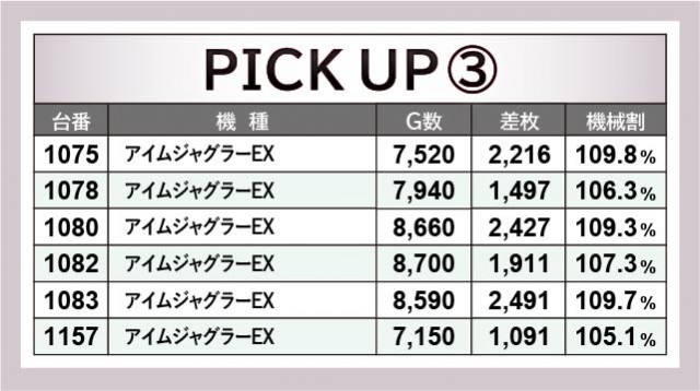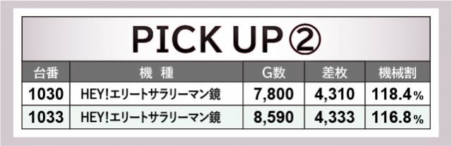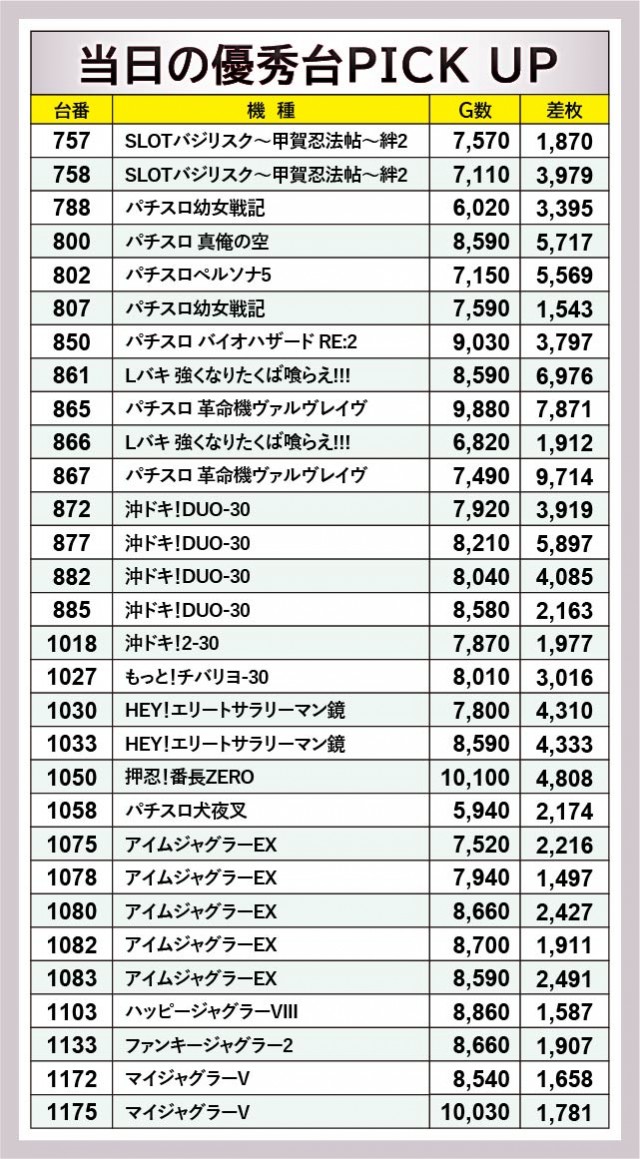 ピックアップされた3機種をチェックすると、いずれも朝からじっくりと打ち込まれた形跡を確認できる。『沖ドキ!DUO-30』877番台+5,897枚という突出した記録はもちろん、『HEY!エリートサラリーマン鏡』からは2台の4千枚OVER台が見られ、活気だけでなく熱気にも満ちていた。『アイムジャグラーEX』も安定感のあるパフォーマンスで、コンスタントにGOGOランプを輝かせていたことだろう。