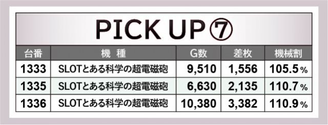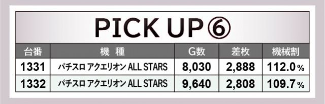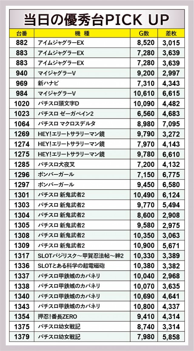 優秀台をチェックすると、多くの万回転OVER台に目を奪われてしまう。『マイジャグラーV』984番台+6,615枚・『パチスロ 新鬼武者2』1301番台+6,124枚・1309番台+5,671枚など回転数と差枚数が比例する展開から、誰もが自信をもって遊技できたと予想できる。また差枚数に目を向けると、『パチスロ マクロスデルタ』1064番台+7,095枚が当日の最大差枚に。6千枚OVER台の数も多く、館内は凄まじい熱気に包まれていたと断言できるだろう。
