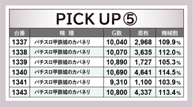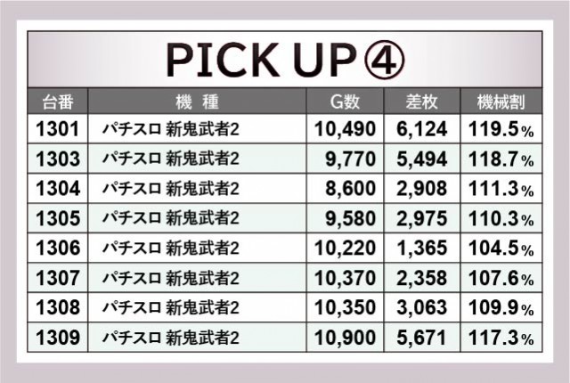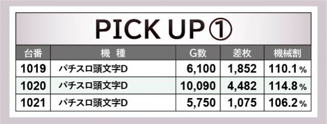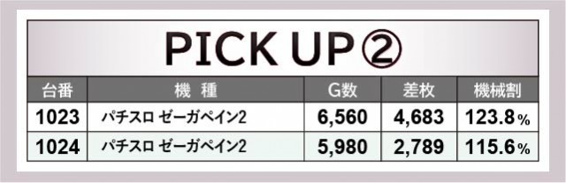 上表で取り上げている機種群は、いずれも全台系となっている。どれもしっかりと好感触を得ていた様子は間違いなく、ファン諸氏はレバーを叩く力が自然と強くなっていたことだろう。『パチスロ頭文字D』1020番台+4,482枚や『パチスロ ゼーガペイン2』1023番台+4,683枚、『パチスロ 新鬼武者2』1301番台+6,124枚・1303番台+5,494枚・1309番台+5,671枚、『パチスロ甲鉄城のカバネリ』1340番台+4,641枚・1343番台+4,337枚等々、総差枚数プラスに大きく貢献した機種群であることは確かだ。