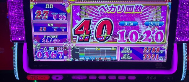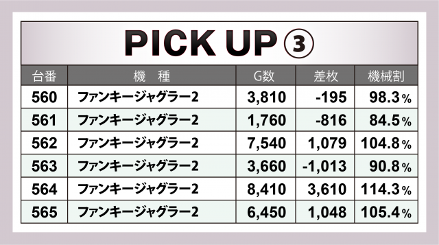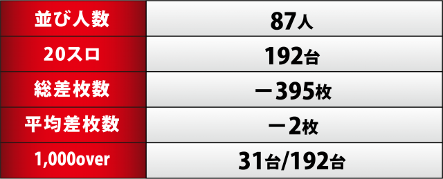今回、[1000円/46枚] スロ全192台のトータル差枚数はマイナスに終わり、前回に続いて2連敗となってしまった。一方、1,000overも台数がダウンし、残念な結果となってしまった。次回の「英雄」取材時に早急なリベンジを果たすことが求められる。景気の良い数字を拝みたい!