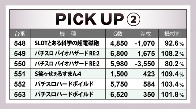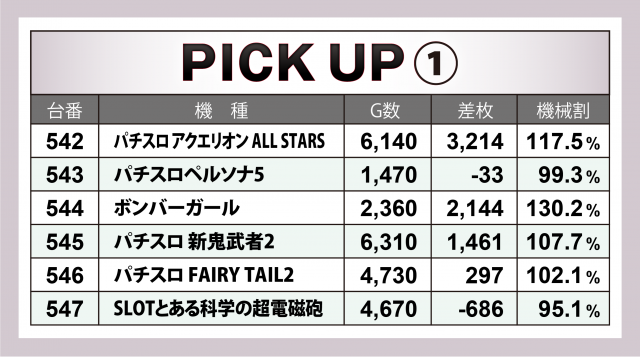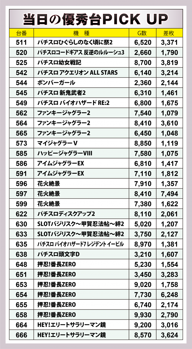 まずは優秀30台のPICK UPから。30台のうち14台が差枚数+2千枚以上を達成、+3千枚以上は9台、+4千枚オーバーは2台となった。後述する横並び好況スポットでは、+4千枚間近に迫った『パチスロ幼女戦記』、共に+3千枚オーバーを記録した『パチスロひぐらしのなく頃に祭2』、+3千枚台×2でトータル+6千枚を超えた『HEY!エリートサラリーマン鏡』がハイスコアを残した。
