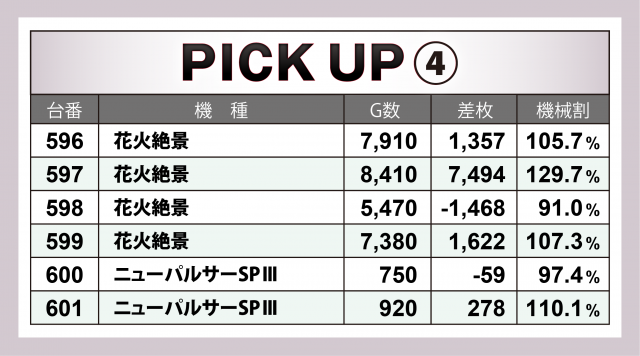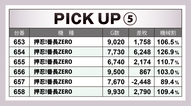 続いては横並び好況スポット5箇所をチェック。まず差枚数の高い2台を生み出したのが『花火絶景』『押忍!番長ZERO』の2機種。前者は+7千枚超の台を筆頭に4台トータルで+9千枚を達成、後者は+6千枚オーバー台をトップに6台合計で+1万1千枚を突破。その他では『パチスロ アクエリオン ALL STARS』『ファンキージャグラー2』が+3千枚突破台を輩出した。