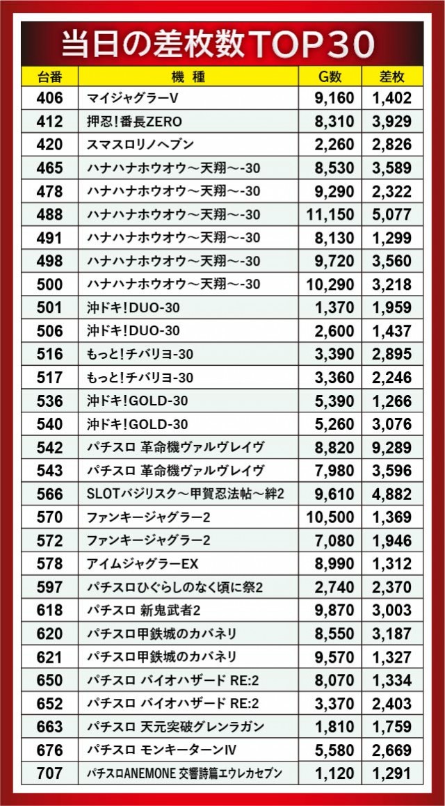 注目のスマスロ『パチスロ 革命機ヴァルヴレイヴ』では、542番台+9,289枚という大記録が発生した。あわや万枚OVERという大きな熱気に対し、沖スロ『ハナハナホウオウ~天翔~-30』488番台+5,077枚や『SLOTバジリスク~甲賀忍法帖~絆2』566番台+4,882枚など、大きな差枚数を築く台も見られる。各所で盛り上がっていたのは確かで、それは各機種のG数を見えても明らかではないだろうか。