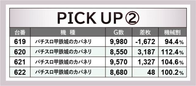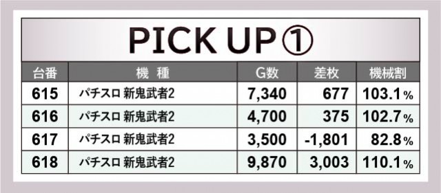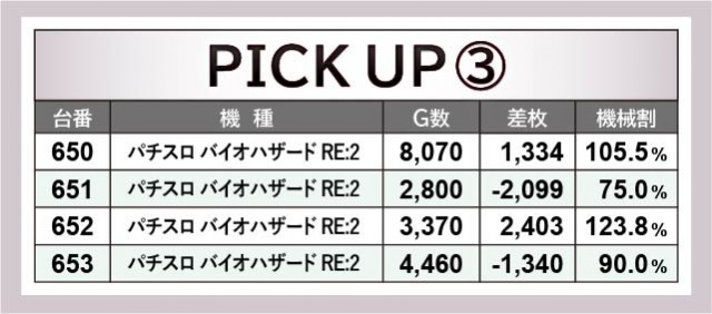 『パチスロ 新鬼武者2』618番台+3,003枚・『パチスロ甲鉄城のカバネリ』620番台+3,187枚・『パチスロ バイオハザード RE:2』652番台+2,403枚など、各機種がしっかりと結果を残している。それぞれ全4台設置の機種であるため、すぐにポテンシャルを感じられたのではないだろうか。朝からじっくりと打ち込まれた形跡からその事実が窺え、ファンは有意義な時間を過ごしていたはずだ。