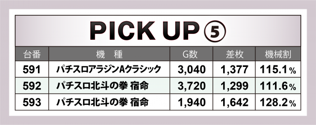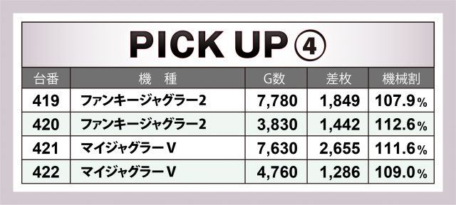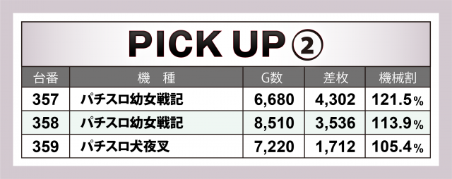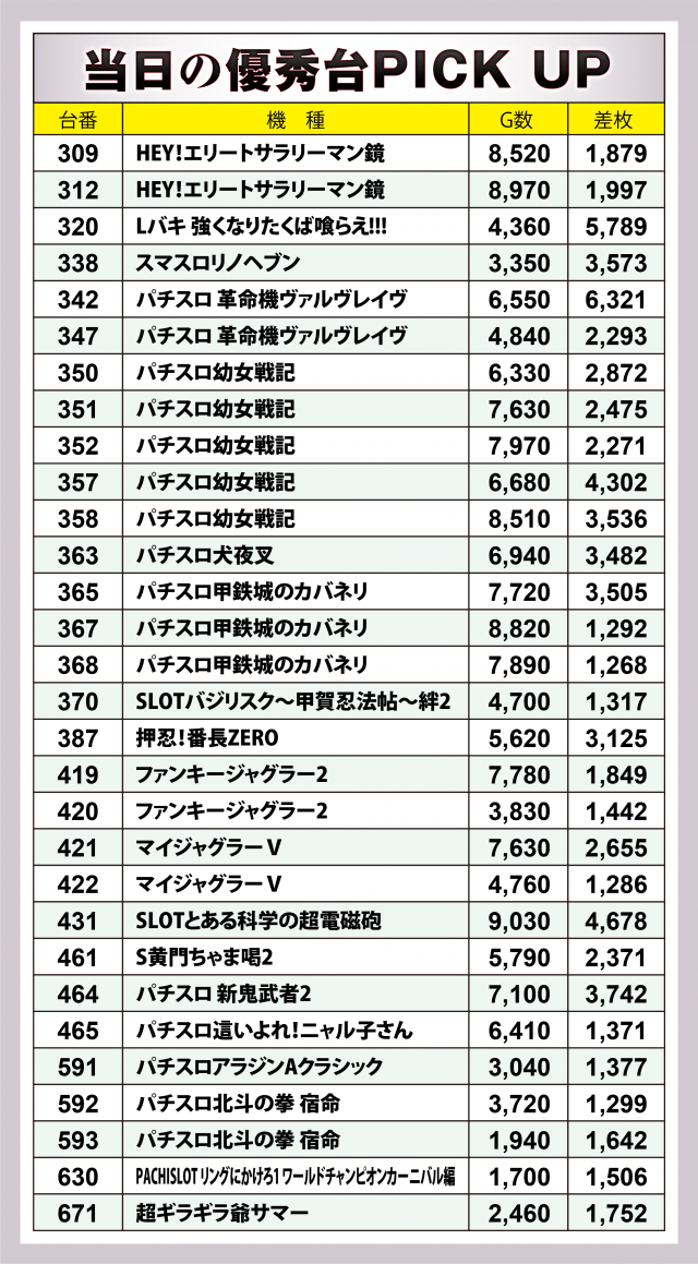 まずは優秀30台のPICK UPから。この日は30台の半数強となる16台が差枚数+2千枚以上を達成、+3千枚以上が10台、+4千枚オーバーが4台となった。後述する横並び好況スポット以外では、スマスロ4機種にハイスコアを記録した台が複数。+6千枚オーバー台を始めに2台合わせて+9千枚に迫った『パチスロ 革命機ヴァルヴレイヴ』、+6千枚目前となった『Lバキ 強くなりたくば喰らえ!!!』、2台の合計で+4千枚到達が見えた『HEY!エリートサラリーマン鏡』、+3千5百枚超をマークした『スマスロリノヘブン』と盛り上がりを見せた。その他では、+5千枚間近となった『SLOTとある科学の超電磁砲』、+3千枚をクリアした『パチスロ犬夜叉』が好成績を残した。