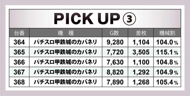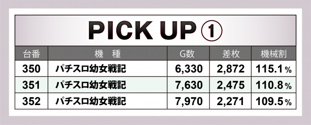 続いては7機種計18台と、5箇所で出現した横並び好況スポットについて。5台の全てが4桁プラスとなったのが『パチスロ幼女戦記』で、+4千枚オーバー台を筆頭に合計+1万5千枚超を記録。また『パチスロ甲鉄城のカバネリ』では+3千枚を超えた台をトップに5台トータルで+8千枚超という結果に。