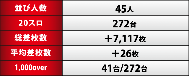 この日20スロ全272台のトータル差枚数は+7,117枚とプラスで終了。また、1,000overの台数は前回より6台増加し全体の2割に近づいた。これでトータルプラスの3連勝を達成、翌年度となる2023年の取材でもより良い成績を残してもらいたいものだ。