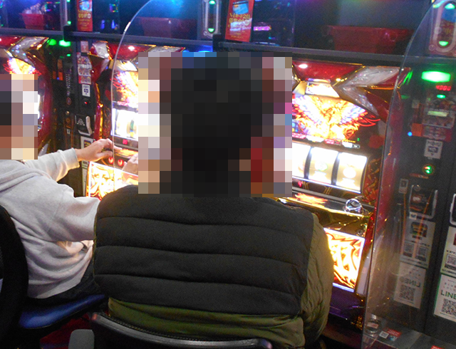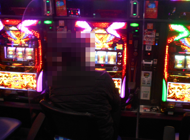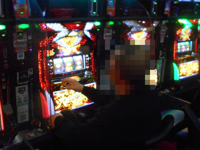 「ハナハナホウオウ~天翔~-30」にて、笑みを浮かべて遊技をおこなっているプレイヤーを確認。
