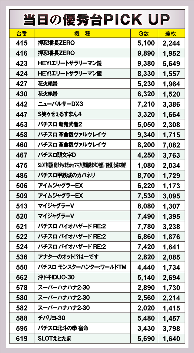 まずは優秀台ピックアップから。人気機種をはじめ、スマスロ、6.5号機、ノーマルタイプなど、各ジャンルにそれぞれ好調台が確認でき、満遍なくチャンスが隠されていたようだ。その中でもっとも差枚数が高かったのは、460番台の「パチスロ 革命機ヴァルヴレイヴ」で、+7,082枚という素晴らしい結果をマーク。次点で423番台の「HEY!エリートサラリーマン鏡」の+5,649枚のほか、+3,000枚オーバーが多数出現していた!