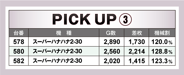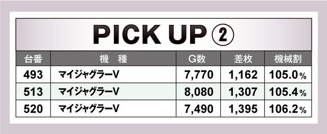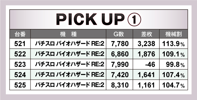 続いてはピックアップ機種の紹介をしていこう。上の優秀台でもしっかりランクインしていた「パチスロ バイオハザード RE:2」は、521番台の+3,238枚を筆頭に多くの機種が好調で、多くのファンで賑わっていた印象。また、「マイジャグラーV」は「パチスロ バイオハザード RE:2」よりも稼働が高く、4ケタを超える台も複数出現していた。「スーパーハナハナ2-30」はあまり回されなかったが、しっかり結果を残していたので、もっと回されていれば、より良い結果が出ていたかもしれないぞ!