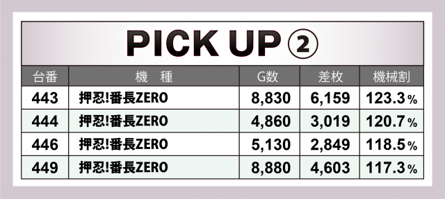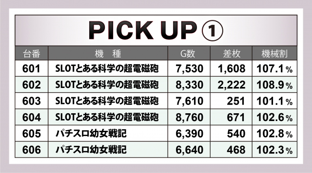 続いては当日好調だった5機種16台をチェック。全ての台が4桁以上の差枚数を達成、中でもハイスコアとなったのが『押忍!番長ZERO』で、+6千枚オーバー台を筆頭に4台トータルで+1万6千枚超えを獲得。さらに『HEY!エリートサラリーマン鏡』は+6千枚突破台を始めに3台の合計で+1万枚を突破。また『パチスロ甲鉄城のカバネリ』では+3千枚クラスが2台、『SLOTとある科学の超電磁砲』は4台合わせて+5千枚間近に迫った。