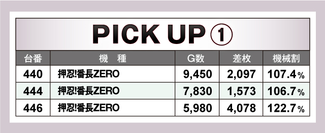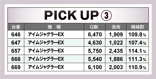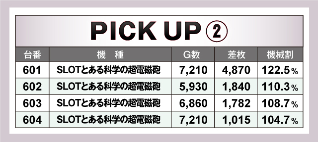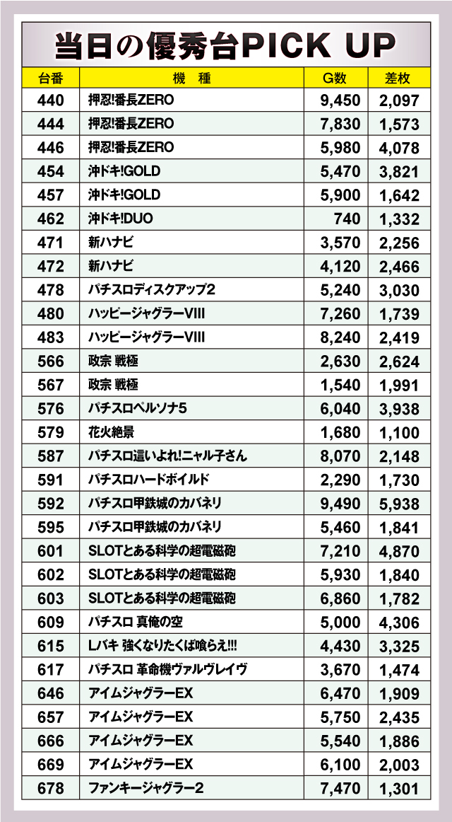 まずは優秀台30台のPICK UPを紹介。幅広い機種がランクインしていたが、とくに6.5号機やジャグラーシリーズが目立っていた印象が強い。そんな中でもっとも差枚数が高かったのは、592番台の「パチスロ甲鉄城のカバネリ」で+5,932枚、次点では601番台「SLOTとある科学の超電磁砲」の+4,870枚と素晴らしい結果がズラリ。その他も4,000枚オーバーや3,000枚オーバーの台も複数台確認できた。