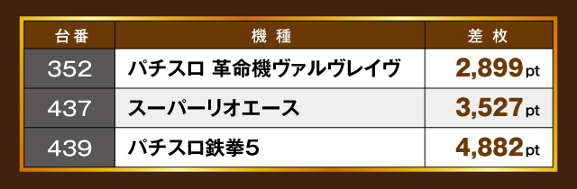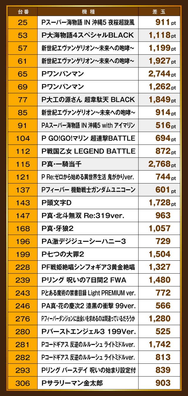 今回が初陣となった「ウエスタン浦安やなぎ通り店」の結果は、先日の「ウエスタン佐倉店」と同じ四カ国制圧と、初回としてはまずまずの成績だった。各国から特に注目したいのが、「令ノ国」と「爆ノ国」。両国とも1,000pt〜4,000ptオーバーを獲得する台が多く出現し、制圧して当然とも言える実力を披露した。さらに、制圧達成した各国の活躍もさることながら、今回は特に援軍の「玉ノ国」の盛り上がりにも注目すべきだろう。実に29台もの優秀台たちが実力を発揮し、ホール中を盛り上げていたぞ! ぜひ次の機会には援軍の力も借りて、全国制圧を目指していきたい!!