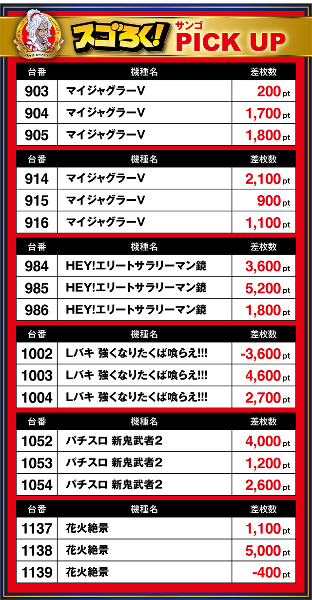 結果も3,600pt、5,200pt、1,800ptとナイスな台が続いたぜ。