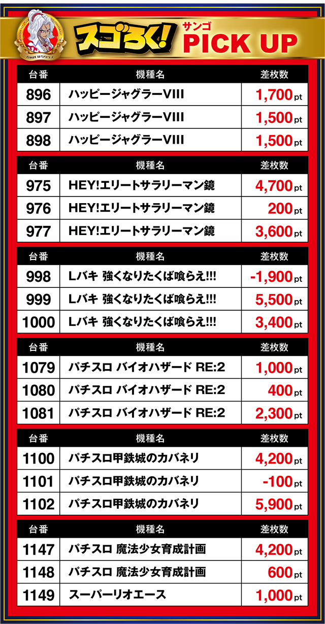 最終的にどの台もプラスで、4,700ptや3,600ptを記録した台もあったぞ。