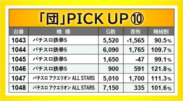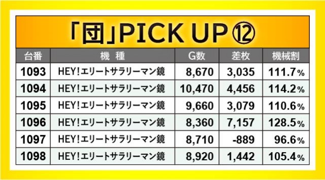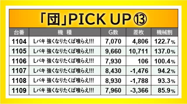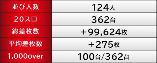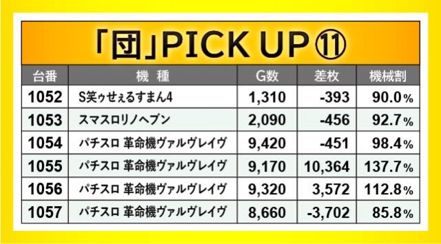 前述したように、『パチスロ 革命機ヴァルヴレイヴ』『Lバキ 強くなりたくば喰らえ!!!』から万枚OVERが発生。1055番台+10,364枚・1105番台+10,711枚が記録されており、圧巻のパフォーマンスには絶句してしまうばかりだ。また『HEY!エリートサラリーマン鏡』でも1096番台+7,157枚という記録が生まれ、文句なしの挙動を見せていた。今後もスマスロが大きな熱気を放ち、店内の盛り上がりをリードしてくれると確信する出来である。