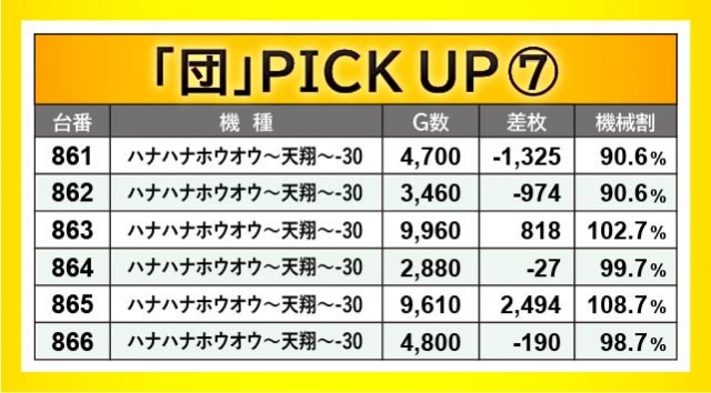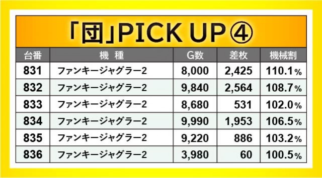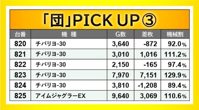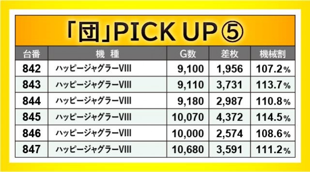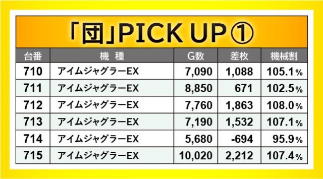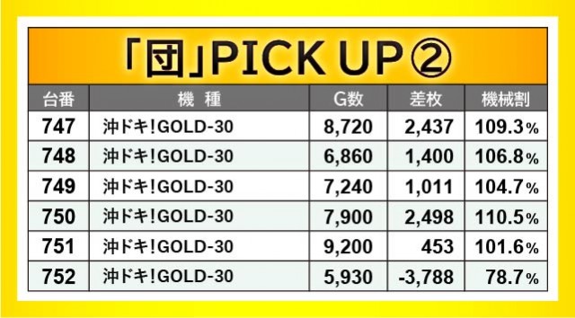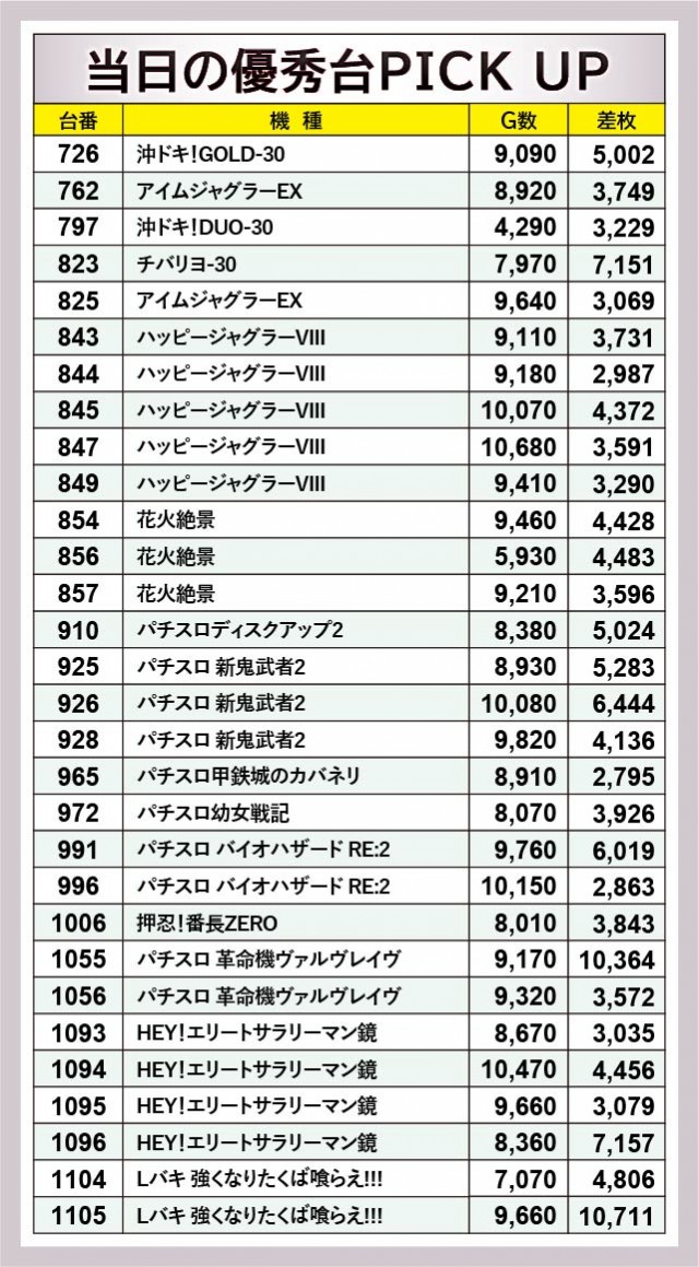 『ジャグラー』シリーズから万回転OVERが発生し、ゲーム数と差枚数が比例するような展開が多々見られる。『アイムジャグラーEX』715番台10,020G・+2,212枚や『ファンキージャグラー2』832番台9,840G・+2,564枚、『ハッピージャグラーVIII』845番台10,070G・+4,372枚などが最たる例だろう。一方で『チバリヨ-30』823番台+7,151枚という記録が生まれており、こちらも沖スロらしいポテンシャルが発揮されていた。