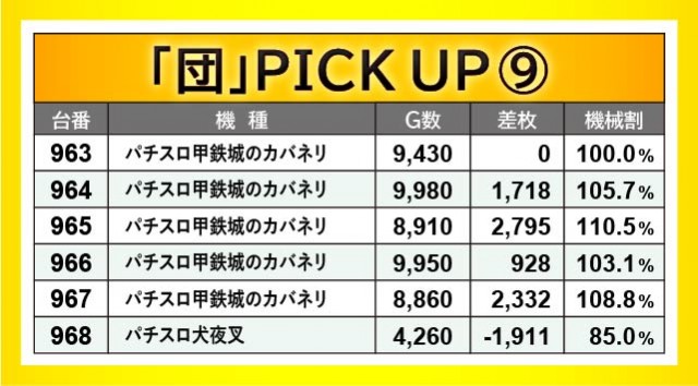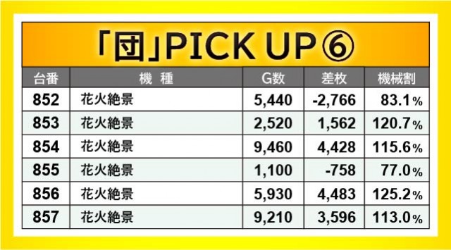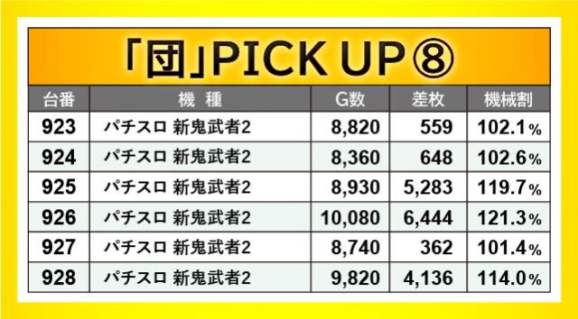 『花火絶景』856番台+4,483枚・『パチスロ 新鬼武者2』926番台+6,444枚・『パチスロ甲鉄城のカバネリ』965番台+2,795枚など、人気AT機は各所で大きな熱気を放っていた。特に『パチスロ 新鬼武者2』は923~928番台の6台が全台プラス差枚になるだけでなく、4~5千枚OVERも発生していたのが何よりも鮮烈だ。