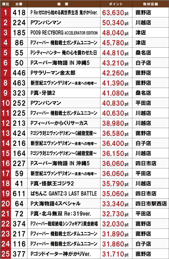 毎月15日に三重ホームラングループ8店舗を同時取材する「ホームランボール」。今月の結果をお伝えしよう。いつも通り人気定番機種である『新世紀エヴァンゲリオン~未来への咆哮~』が幅を利かせてくるかと思いきや今月は3台のみ。同じく人気機種である『Pフィーバー 機動戦士ガンダムユニコーン』のほうが4台あり、まだまだこの2大巨頭の争いは終わりそうにない。それ以外だと各店舗、多種多彩な機種が優秀台になっている。どの店舗でどの番台が優秀台になったのかチェックして次回実施の際の参考としよう。