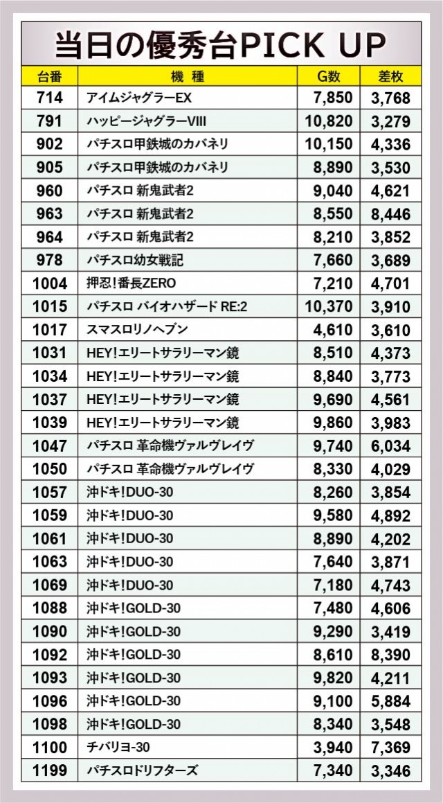 ピックアップされた優秀台に『沖ドキ!DUO-30』『沖ドキ!GOLD-30』の名前がズラリと並び、3~4千枚OVERが多発する状況下で、1092番台+8,390枚という鮮烈な記録が生まれた。負けじと『チバリヨ-30』1100番台+7,369枚が発生し、さらにはAT機から『パチスロ 新鬼武者2』963番台+8,446枚という大記録も見られる。突出した記録も各所で生まれており、店内は凄まじい熱気に包まれていたと言えるだろう。