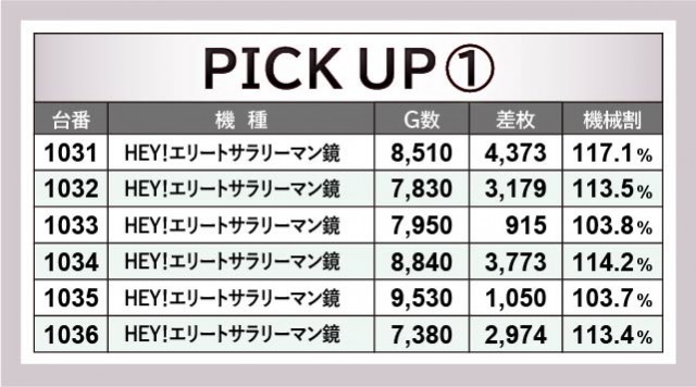 各機種が活躍するなか、『HEY!エリートサラリーマン鏡』はまとまりのある奮闘を見せていた。1031~1036番台の横並びは全台プラス差枚を達成しており、1031番台+4,373枚や1034番台+3,773枚のように、充実感のある結果を残している。消化されたゲーム数を鑑みても、遊技していたファンの誰もが手ごたえを感じていたのは間違いない。
