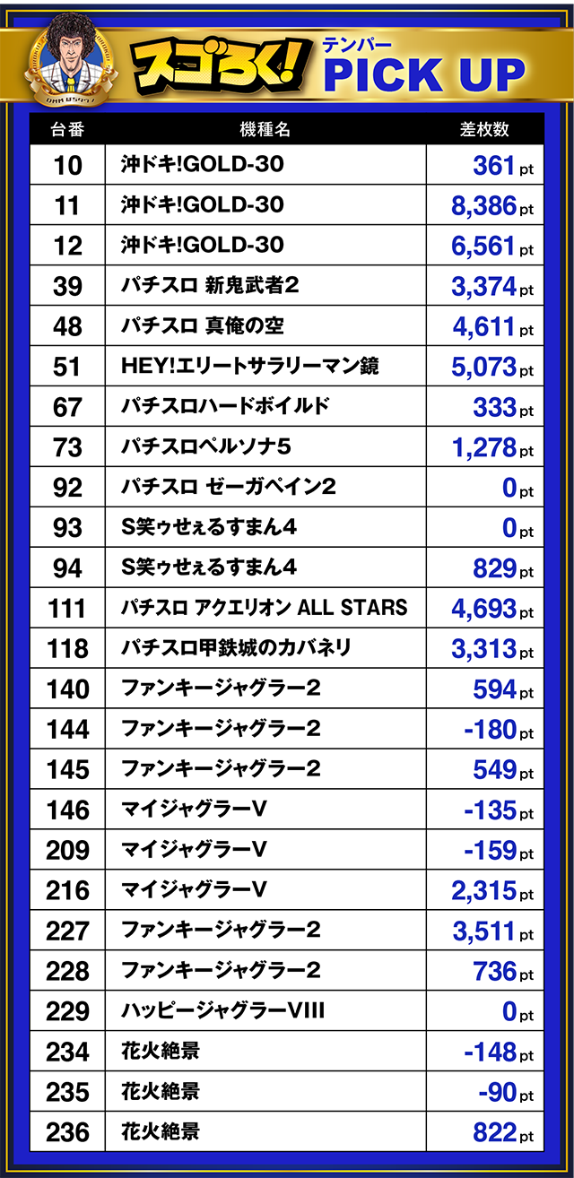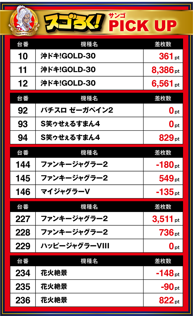 ほかにも、118番台の「パチスロ甲鉄城のカバネリ」が3,000pt以上だったり、「ファンキージャグラー2」の複数台がプラスだったりと、みどころが満載!!