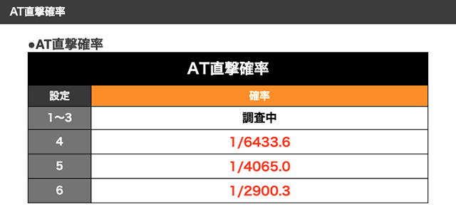通常時からのAT直撃確率は高設定ほど高く、設定4と6では当選率に倍以上の差がある。