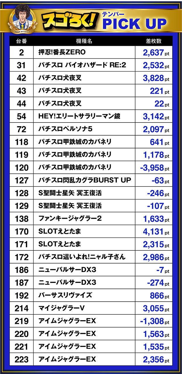 54番台の「HEY!エリートサラリーマン鏡」と214番台の「マイジャグラーV」も注目をしていた台で、3,000pt以上とナイスな結果を残したぞ。