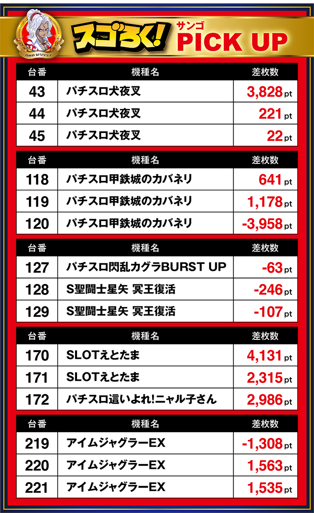 結果はどの台もプラスで、42番台は3,838ptを記録したぞ。