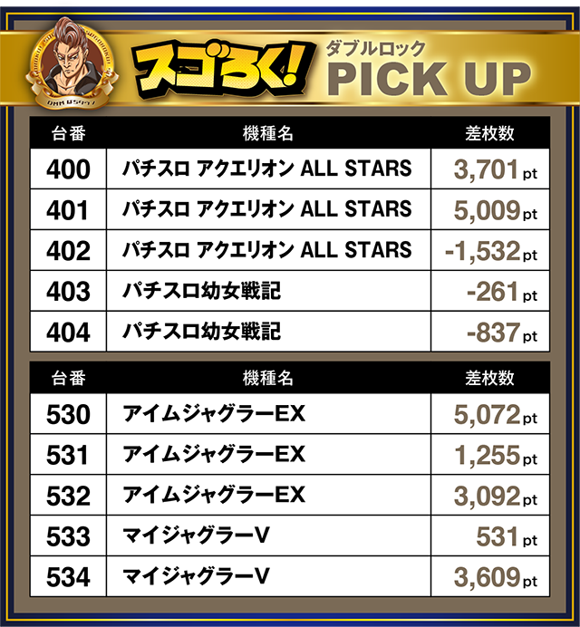 「パチスロ アクエリオン ALL STAR」は400番台から402番台までで、最終的には2台がプラス。