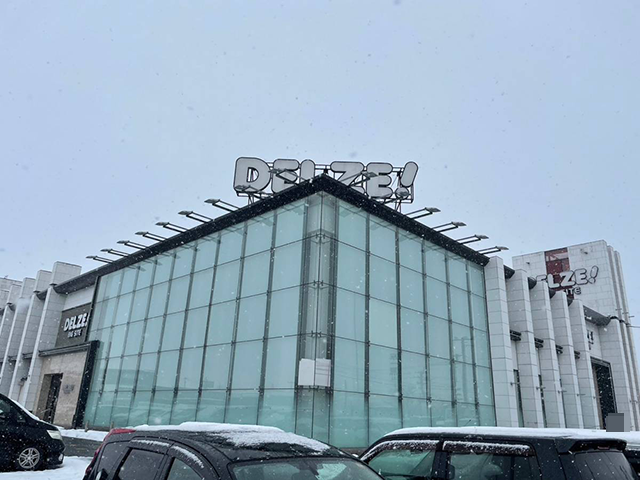 雪がふるなか、「デルゼビッグサイト新潟南店」へとむかった。