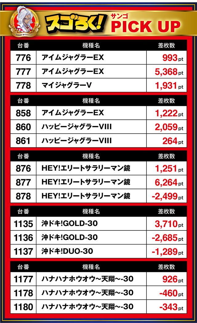 オレが気になったのは、「アイムジャグラーEX」の776番台から「マイジャグラーV」の778番台までの3台。
