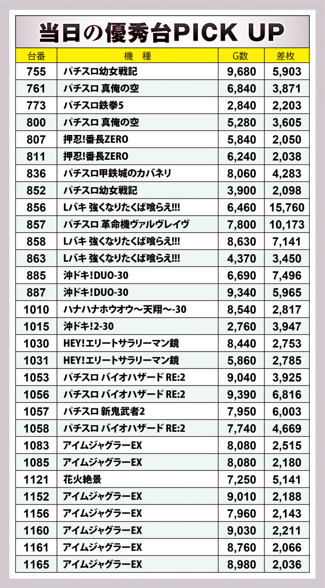 まずは優秀30台のPICK UPから。30台全てが差枚数+2千枚以上を達成し、+3千枚以上は全体の半数強の16台、+4千枚オーバーは11台、+5千枚オーバーは9台と、かなりのハイレベルな状況となった。さらに、+1万枚オーバーは2台も! 後述する好調マシン4機種以外では、なんと言っても話題のスマスロ『パチスロ 革命機ヴァルヴレイヴ』に注目。+1万枚突破のホームランが飛び出した。さらに、+6千枚超×1・+4千枚クラス×2で3台の合計が+1万7千枚に迫った『パチスロ バイオハザード RE:2』、+6千枚を上回った『パチスロ 新鬼武者2』、+6千枚間近に辿り着いた『パチスロ幼女戦記』、+5千枚超を記録した『花火絶景』が上位で目立つ結果となった。