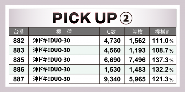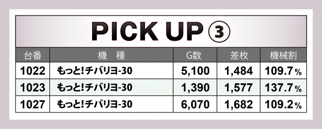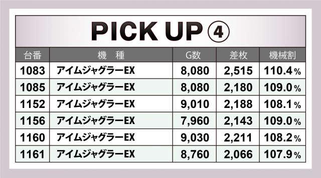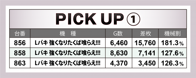 続いては好調4機種計17台をチェック。今回は17台全てが4桁プラスを果たし、『ヴァルヴレイヴ』の万枚突破台をさらに飛び越えたのが同じくスマスロの『Lバキ 強くなりたくば喰らえ!!!』。+1万5千枚オーバー台を筆頭に3台トータルで+2万6千枚を突破! さらには+7千枚超&+5千枚超が1台ずつで5台の合計が+1万7千枚をクリアした『沖ドキ!DUO-30』、6台各々が+2千枚台の差枚数をゲットした『アイムジャグラーEX』が躍進を果たした。