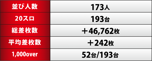 今回、20スロ193台のトータルは+46,762枚と、過去12回の差枚数と比べて最多記録を更新した。また1,000overは全体の4分の1強となり、その台数も最高値をマーク。1月中旬とは言え、正月気分が残っためでたい結果となった。これでトータルプラスの6連勝を達成、どこまで白星を続けていけるかと共に、クオリティの維持に期待したい。