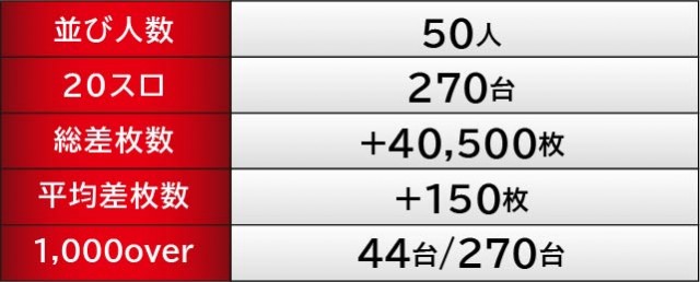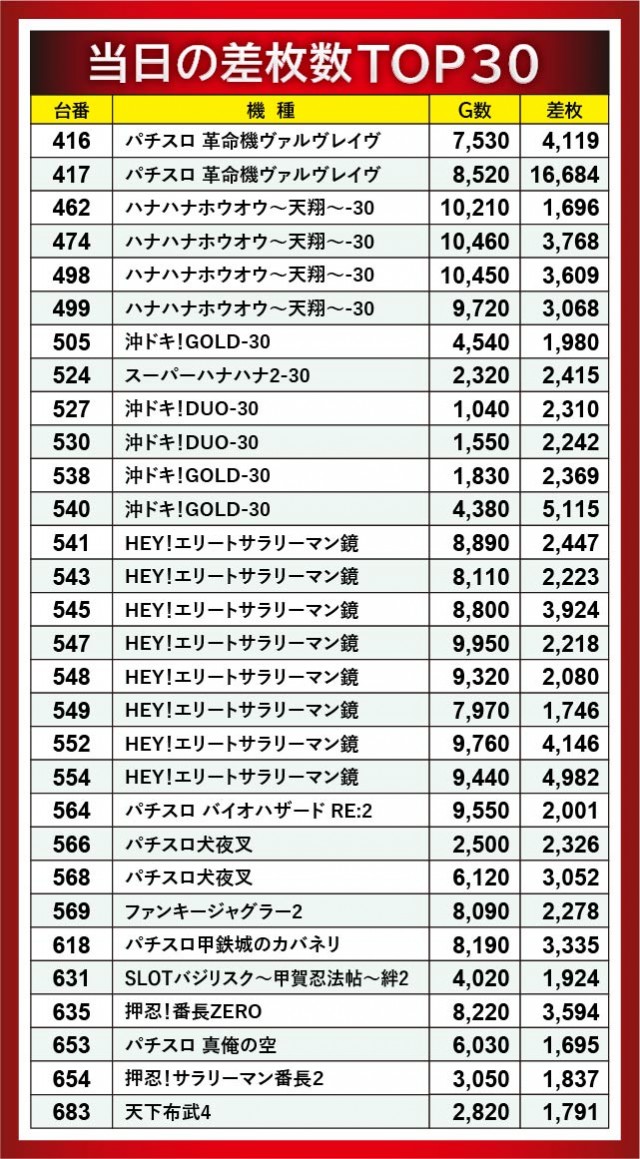 前回に引き続き、『パチスロ 革命機ヴァルヴレイヴ』にて万枚OVERが発生。417番台+16,684枚が飛び出し、さらには同機種416番台+4,119枚が記録されるなど、凄まじい熱気が放たれていた様子が如実に窺える。『HEY!エリートサラリーマン鏡』についても、552番台+4,162枚・554番台+4,982枚といった記録が生まれ、この日の主役はスマスロがかっさらっていった格好と言えるだろう。