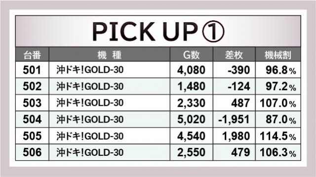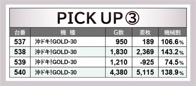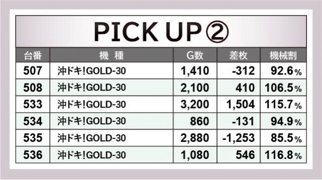 沖スロ人気を牽引する『沖ドキ!GOLD-30』は、全台がポテンシャルの高さを感じ取れた。540番台+5,115枚が最高記録となっており、他にも538番台+2,369枚という数字が残されるなど、各所で熱気を放っていたのが印象的だ。残念ながら全台が終日打ち込まれた状況ではなかったものの、もしもフル稼働で朝から閉店まで遊技されていれば、より大きな熱気を放っていたのは間違いない。