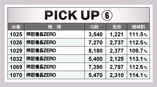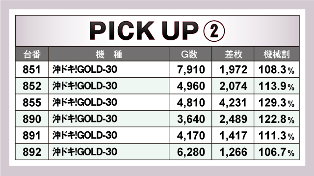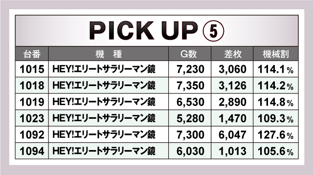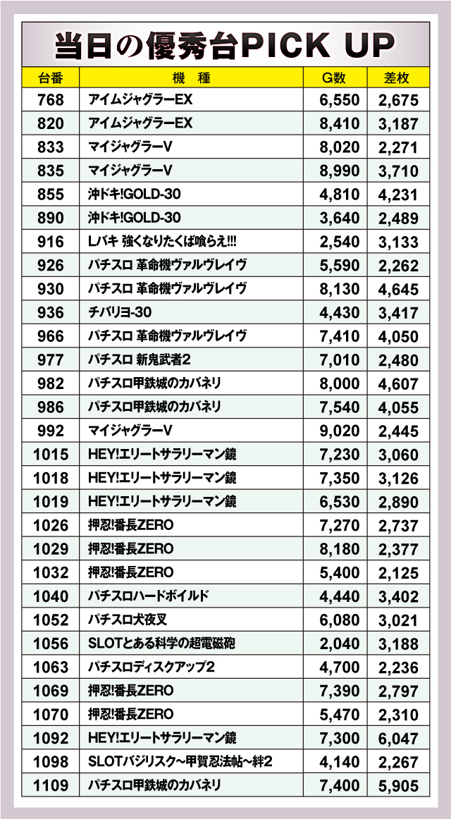 まずは優秀30台のPICK UPから。約半数の16台が+3,000枚オーバー、その中でももっとも好成績だったのが1092番台の「HEY!エリートサラリーマン鏡」で+6,047枚と上々の結果をマーク。その他も5,000枚/4,000枚クラスの台が複数台確認することができた。スマスロ&6.5号機を中心に多くの機種が店内を大いに賑やかしていた!