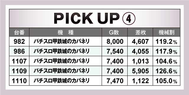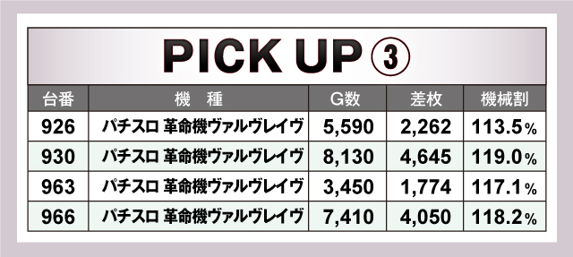 続いてはとくに好調だった6機種を紹介。どの機種も素晴らしい結果を残していたが、とくに「パチスロ 革命機ヴァルヴレイヴ」「HEY!エリートサラリーマン鏡」のスマスロ、「パチスロ甲鉄城のカバネリ」の6.5号機など、高い差枚数が続出していた!