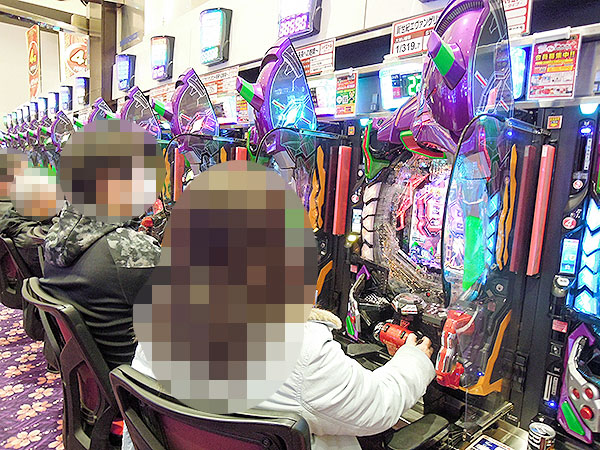 15時半過ぎの4円パチンコでは、「Pスーパー海物語 IN 沖縄5」や「新世紀エヴァンゲリオン〜未来への咆哮〜」のシマから活気が感じられ、プレイヤーのイキイキとした表情が印象に残っている。