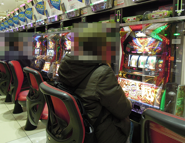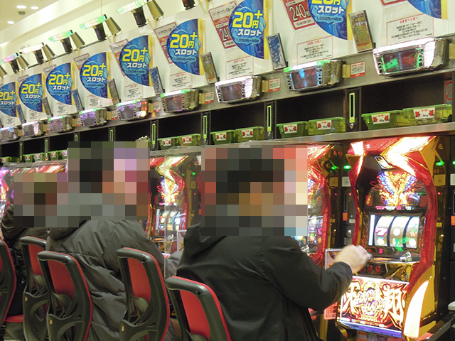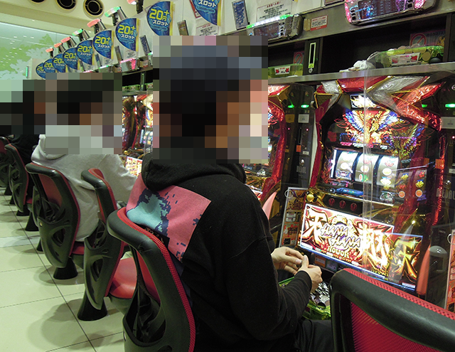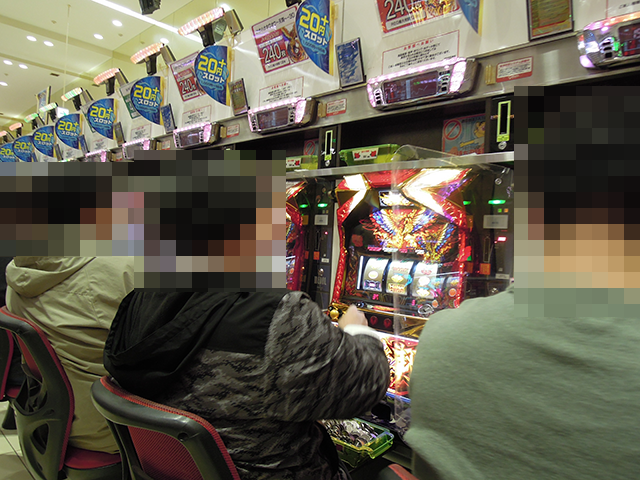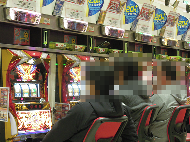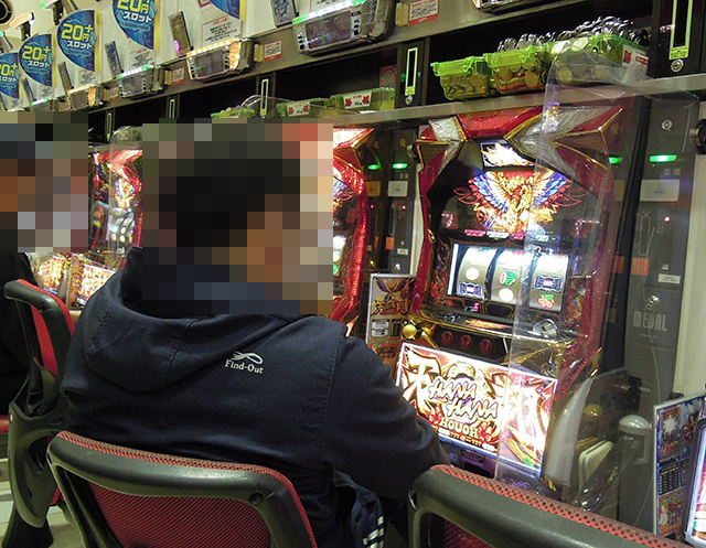 楽しそうな光景が広がっているパチスロコーナーで、5台の「ハナハナホウオウ~天翔~-30」をチョイス。