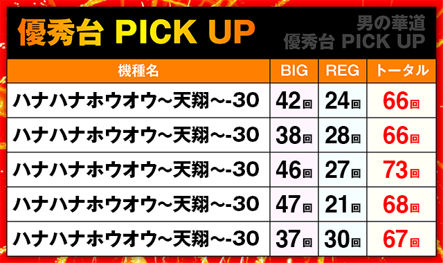 全台のボーナス回数が66回以上を記録しており、1台が70回を上回る結果となった。