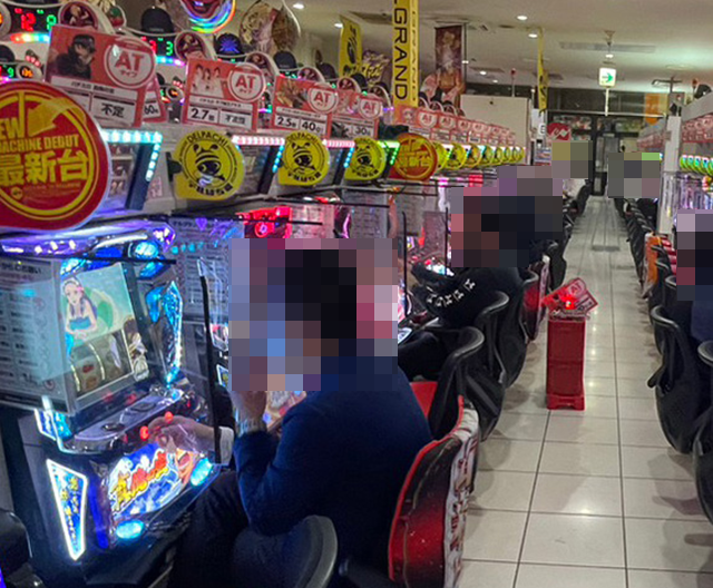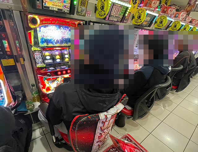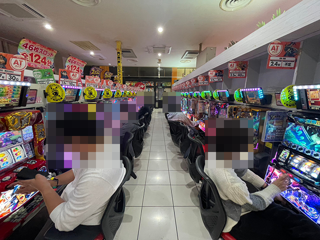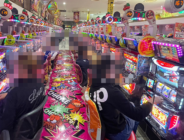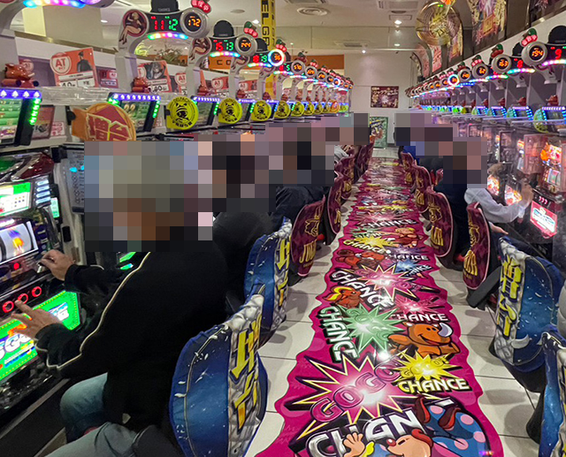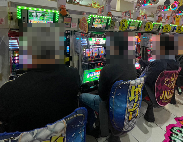 夕方頃のパチスロコーナーでは、ジャグラーシリーズがにぎわっていた。