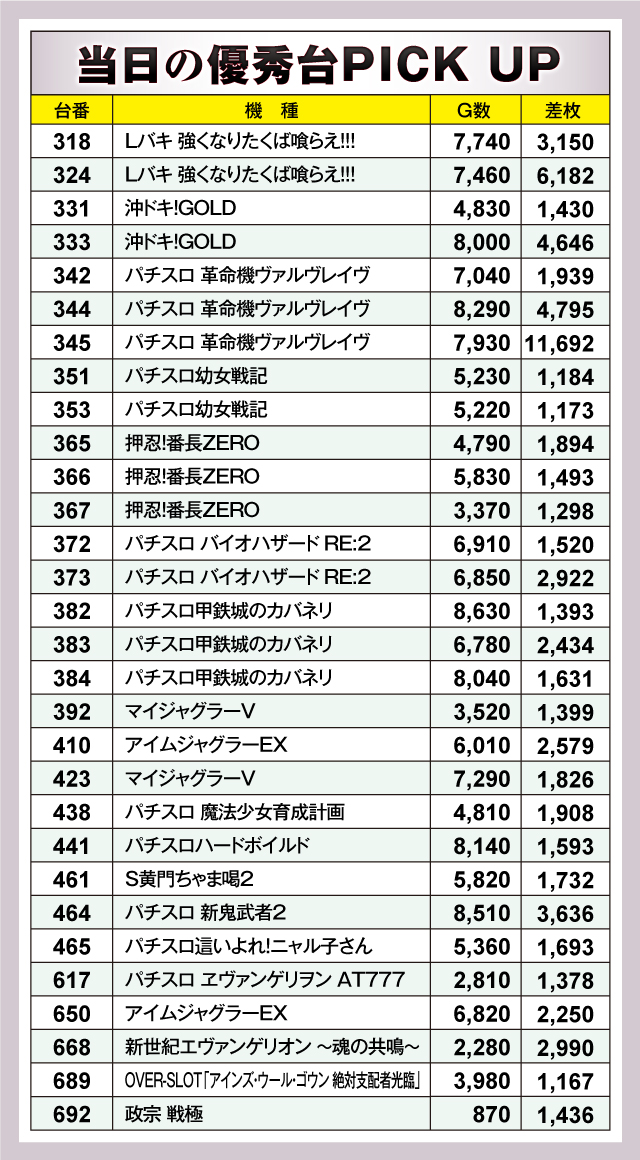 優秀台をチェックすると、+11,692枚と大台を越えてきた『パチスロ 革命機ヴァルヴレイヴ』の345番台に注目が集まる。ホールに登場して以来、連日そのパワーを見せつけているスマスロだが、ここでもやはり高いポテンシャルを発揮してくれた。また、同機種は344番台も+4,795枚を記録している。2番手となったのもスマスロ『Lバキ 強くなりたくば喰らえ!!!』で、324番台が+6,182枚を記録した。「スマスロのライバルはスマスロ」ということか。なお、同機種は318番台も+3,150枚をマークしている。これに続いたのが+4,646枚を記録した『沖ドキ!GOLD』の333番台。人気シリーズの最新機種が、早くも実力を見せてくれた。以下、+3,636枚の『パチスロ 新鬼武者2』461番台、+2,990枚の『新世紀エヴァンゲリオン 〜魂の共鳴〜』668番台、+2,922枚の『パチスロ バイオハザード RE:2』373番台と続いた。