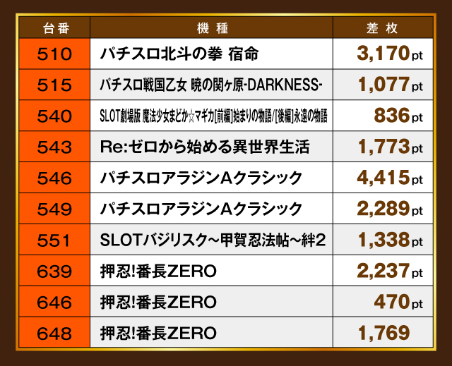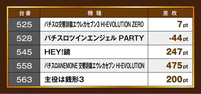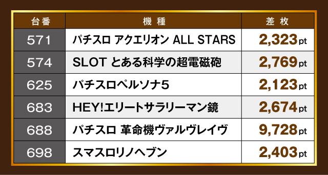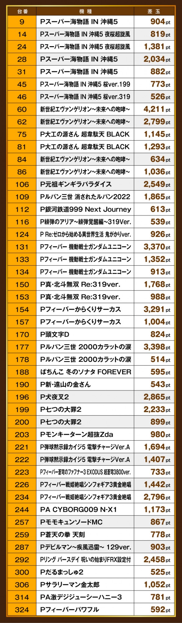 今回の「ウエスタン浦安やなぎ通り店」は五カ国制圧と、四カ国制圧だった前回から一歩前進となった。今回注目すべきは「爆ノ国」の成績が飛び抜けていて、『パチスロ 革命機ヴァルヴレイヴ』ではもう少しで大台に到達する+9,728ptと素晴らしい成績を残していた。他の国も盛り上がっていた今回の「六国記」。次こそ、全国制圧に手が届くハズ!!