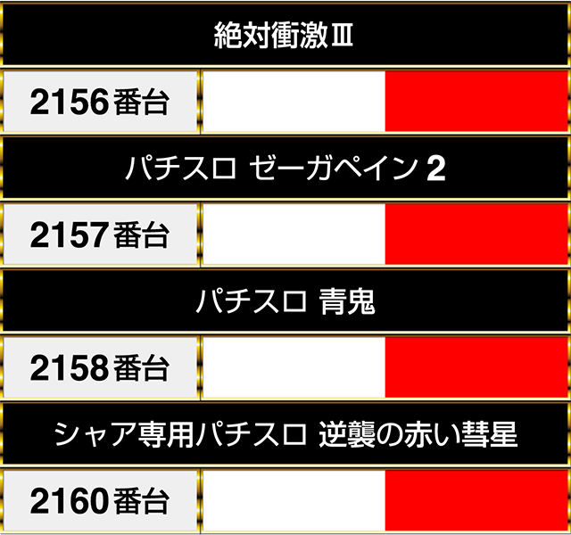 1日を通したデータをみると、2156番台の『絶対衝激Ⅲ』から2160番台の『シャア専用パチスロ 逆襲の赤い彗星』までにプラスptが並んだ。